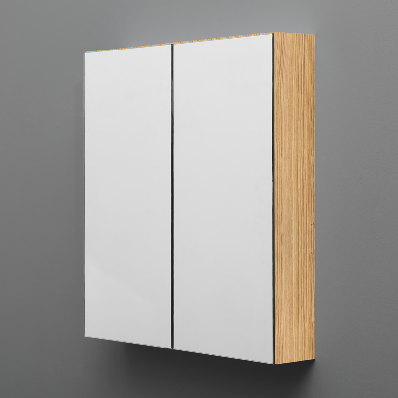 Spegelskåp 80 med mjukstängande dubbelsidiga spegeldörrar. Flyttbara glas-hyllor och hyllor med fallskydd, hyllbärare som griper tag om hyllan på ett säkert sätt. Smidiga upphängningsbeslag för enkel installation och justering. Ljusramp, armatur, under-belysning samt 230 V-uttag kan väljas till.