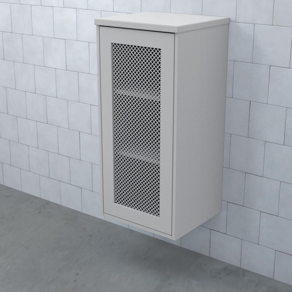 Skåpsluckan Klöver är tillverkad av galvaniserad stålplåt med klöverutstansat mönster vilket ger möbeln en rå och industriell känsla. Inuti skåpet finns hyllplan i samma utförande som skåpet.