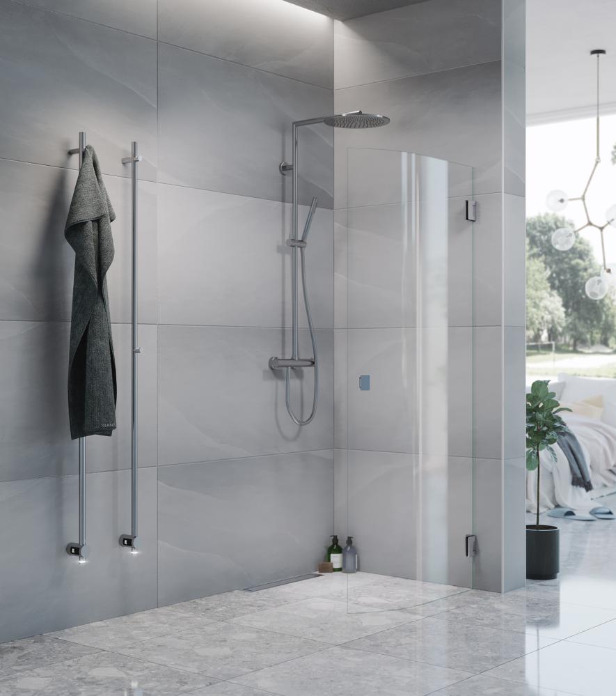 Den minimalistiska designen på Grace tilltalar många i form och uttryck och skapar ett lyxigt badrum med stora glasytor och vackra detaljer. Grace Dörr är en lyxig duschlösning med en rundad form för dig som söker det lilla extra. Dörren har ett elegant handtag så att man enkelt kan fälla in den välvda dörren mot väggen efter användning. Välj Grace Dörr med beslag i olika färgvarianter.