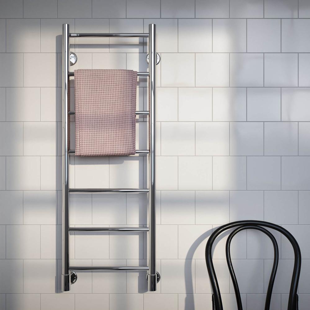 Den stilrena och enkla handdukstorken Almenäs är designad i klassiskt stegutförande. Utmärkande är dess smala bredd på 43 centimeter vilket gör Almenäs till ett perfekt val i smalare utrymmen. Det polerade rostfria stålet ger både en vacker lyster och en beständig, miljövänlig produkt. Almenäs finns i två storlekar med fem, alternativt sju, rör. Denna elektriska modell värms upp av en värmekabel inne i handdukstorken. Den låga effekten ger även en låg energi­förbrukning. Välj mellan att ansluta med dold elanslutning genom fästet eller med stickkontakt till ett vägguttag. Dold elanslutning går att få placerad på höger eller vänster sida.