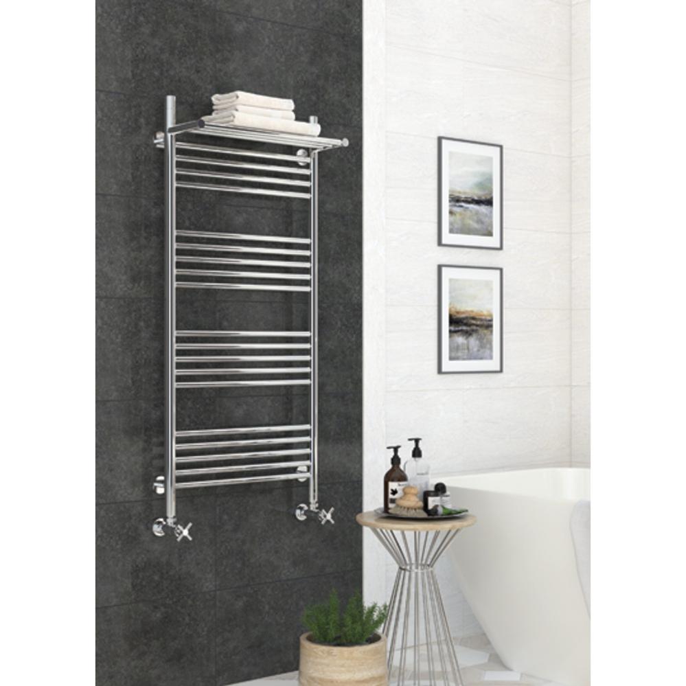 Praktisk modell i rostfritt stål med avlastningshylla upptill.