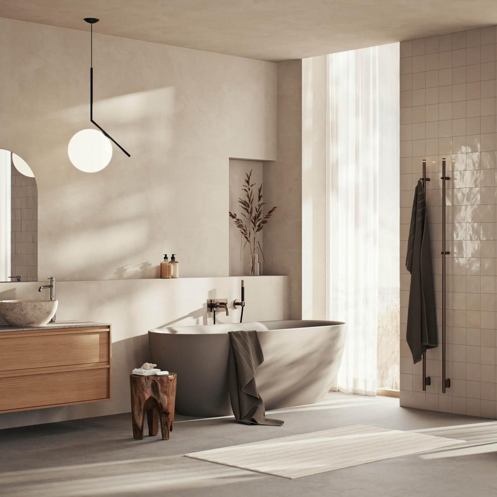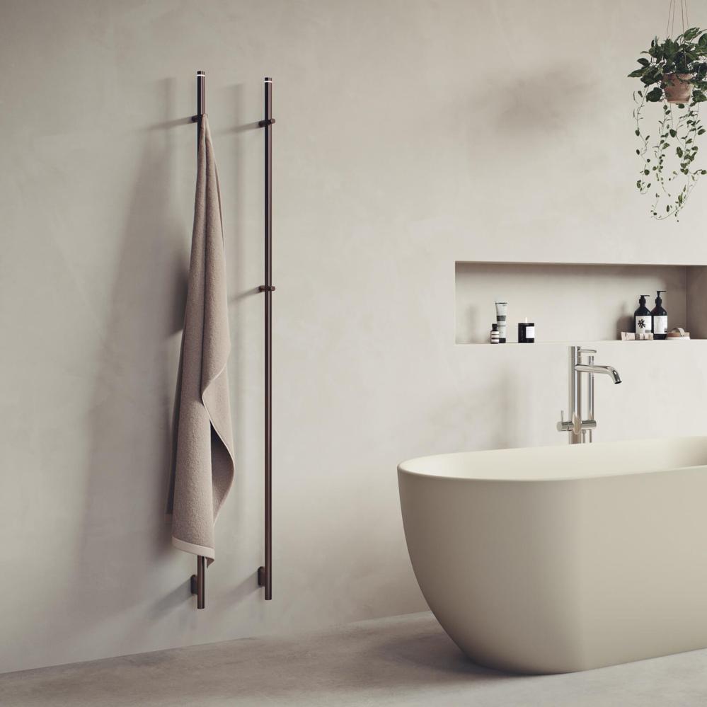 Elektrisk handdukstork som andas perfekt enkelhet. Designen är rak och användningen självklar. Nidingen finns i fyra ytor; borstat rostfritt, mattsvart, brons och krom. Höjden är 1700 mm.