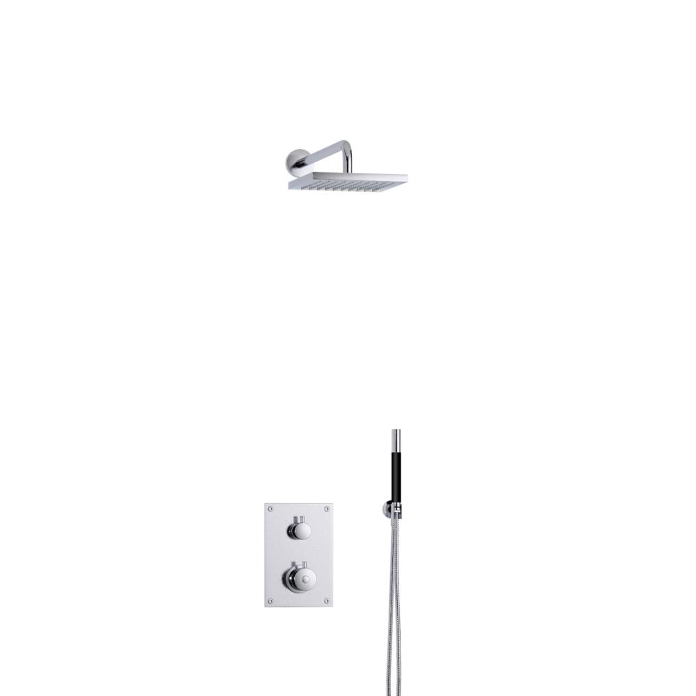 Duschsystem med tryckbalanserad termostatblandare. Inbyggd. Färg: Krom. Diameter takduschhuvud: 250 mm. Längd utstick utloppshuvud: 120 mm. Produktmått (BxHxD): 150 x 95 x 95 mm.