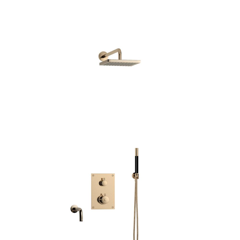Duschsystem med tryckbalanserad termostatblandare och pip för badkar. Inbyggd. Färg: Polerad Mässing. Produkthöjd: 513 mm. Produktbredd: 150 mm. Produktdjup: 513 mm. Diameter takduschhuvud: 250 mm. Utstick utloppshuvud: 400 mm.