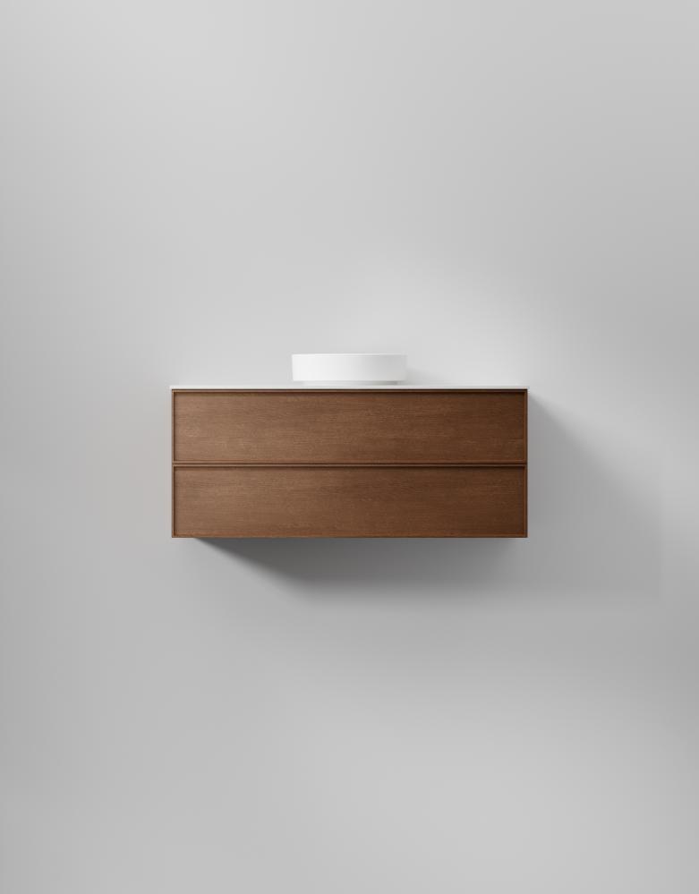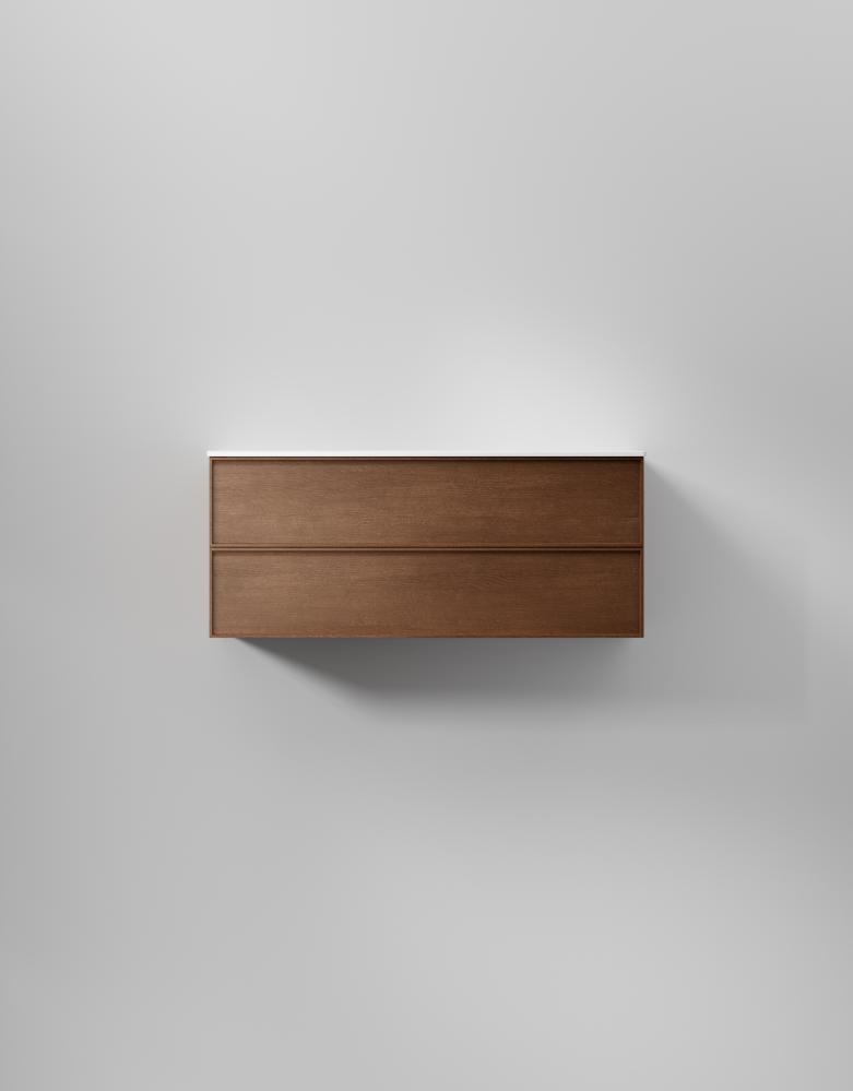 Slät front med ram med dolt grepp ger denna svensktillverkade badrumskommod en distinkt och stilren karaktär. Välj fanér för en modern retrokänsla. Lådor med soft-close och antiglidmattor kombinerar stil och funktion, medan TX Top Extreme™ ytbehandlingen skyddar mot fukt och slitage i minst 15 år. Välj mellan porslinstvättställ, solid surface med en matt finish, eller en bänkskiva med ovanpåliggande tvättställ för att skräddarsy din kommod. Anpassa med val som sensorstyrd belysning och dubbelt eluttag.