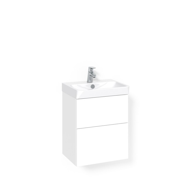 Crown kommod har två mjukstängande och rymliga lådor. Plain vit finns även som lucka inkl handtag. Tvättställ Light 70 ingår alltid och är av äkta sanitetsporslin. Enkel montering.