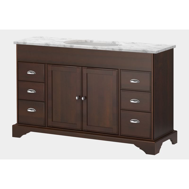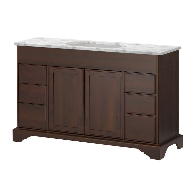 Sekel Kommod 130 Cognac (björk). 130. Ingår: vattenlås, 2 st lådindelare, lådmatta | Beställs separat: stenskiva med underlimmat tvättställ | Tillval: beslag, eluttag för låda | Golvstående med sockel | Mått på kommod är angivet med stenskiva.