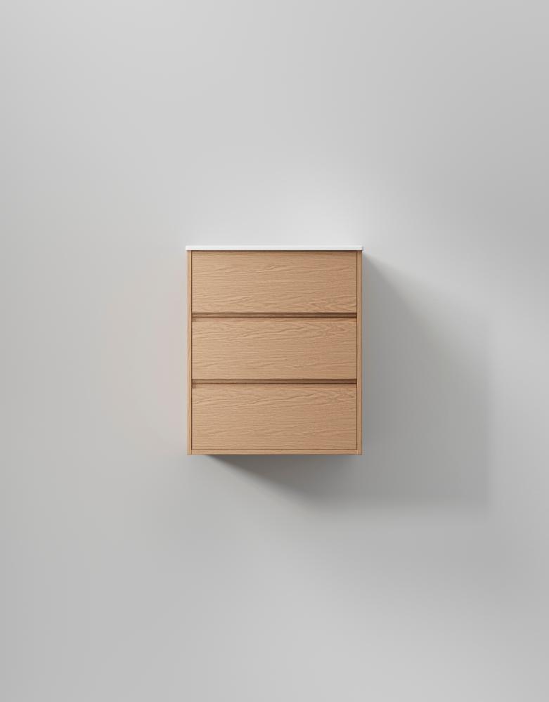 Terra Grip kombinerar en slät front med en diskret grepplist som löper längs hela lådan och ger ett sofistikerat intryck. Fanéret har ett tydligare och större mönster än i INR:s övriga serier, vilket ger möbeln en varm och naturlig karaktär som förändras med ljusets skiftningar. En solitär i sitt uttryck, en möbel som verkligen tar plats och blir badrummets självklara mittpunkt. Vill du ha en mer avskalad känsla finns Terra Grip också i Pure White.