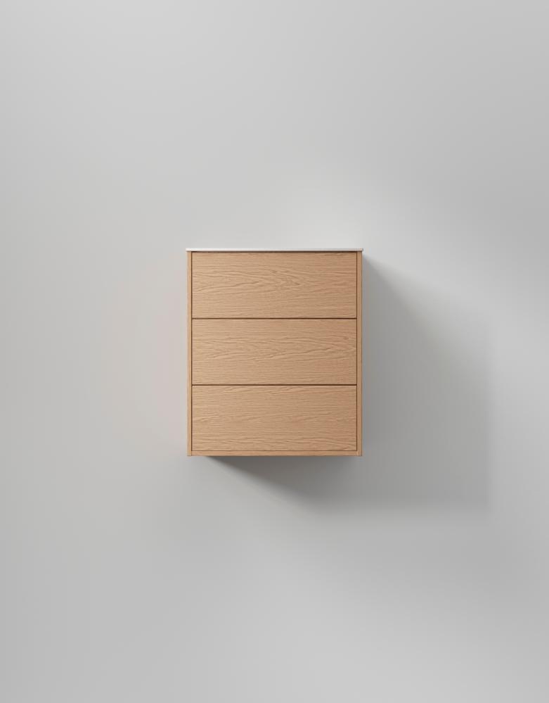 Trots sin kompakta bredd rymmer möbeln tre lådor. Formspråket är stilrent och kompromisslöst, byggt på skandinaviskt hantverk med genomtänkta detaljer på alla plan.