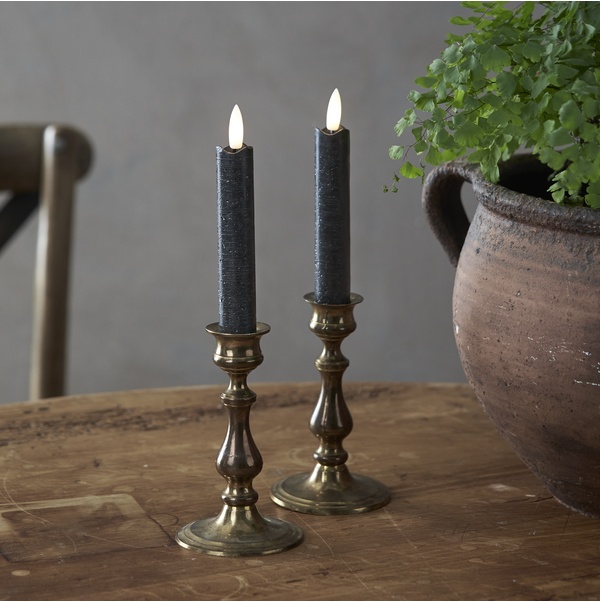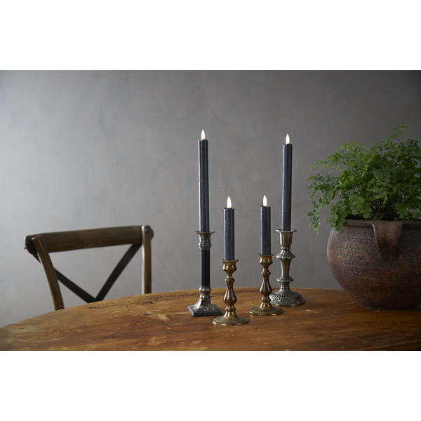 2 pack korta Antikljus i vår Flamme serie, gjorda i vax i svart färg med en rustik yta. Ljusen har en mycket naturtrogen låga som lyser med varmvitt sken. De har timerfunktion vilket gör att ljusen lyser i 6h per dag i ca 30 dagar. De drivs av 1 AA batteri för varje ljus, dessa ingår ej.