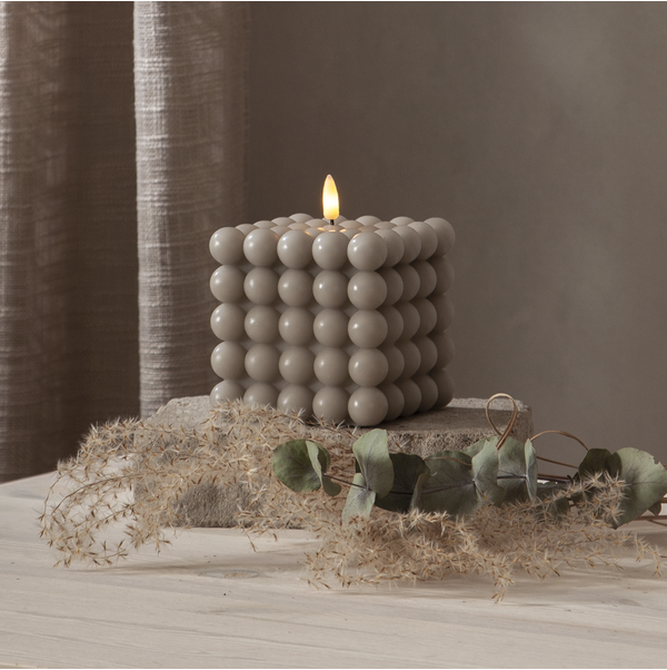 Flamme Dot är ett fyrkantigt ljus gjord av grått vax med en bubblig yta. Ljuset är cirka 10x12,5cm inklusive lågan. Detta elektriska ljus blir en vacker dekoration, både ensam och i grupp ihop med övriga ljus från vår Flamme serie. Den har timerfunktion och när brytaren är på timerläget lyser ljuset i ca 25 dagar med en vacker realistisk låga i varmvitt. Den drivs av 2 AA batterier, dessa ingår ej.