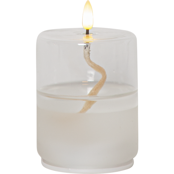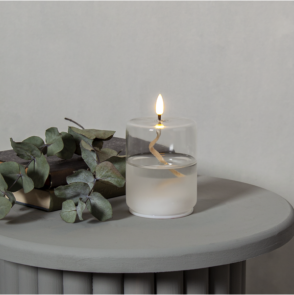 Flamme Float är ett ljus med glasbehållare med transparent vax inuti som ger en känsla av oljeljus där veken flyter. Det genomskinliga vaxet kan innehålla luftbubblor vilket ger ett än mer naturtroget utseende. Ljuset är cirka 8x13cm inklusive lågan som sticker upp ur glaset. Detta elektriska ljus blir en vacker dekoration, både ensam och i grupp ihop med övriga ljus från vår Flamme Float serie. Den har timerfunktion och när brytaren är på timerläget lyser ljuset i ca 30 dagar med en vacker realistisk låga i varmvitt. Den drivs av 3 AAA batterier, dessa ingår ej.