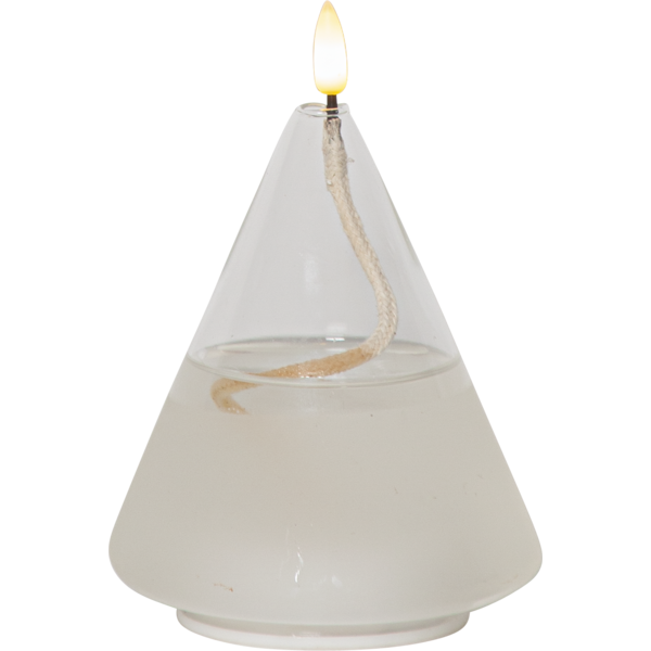 Flamme Float är ett ljus med konformad glasbehållare med transparent vax inuti som ger en känsla av oljeljus där veken flyter. Det genomskinliga vaxet kan innehålla luftbubblor vilket ger ett än mer naturtroget utseende. Ljuset är cirka 11,5x15,5cm inklusive lågan som sticker upp ur glaset. Detta elektriska ljus blir en vacker dekoration, både ensam och i grupp ihop med övriga ljus från vår Flamme Float serie. Den har timerfunktion och när brytaren är på timerläget lyser ljuset i ca 30 dagar med en vacker realistisk låga i varmvitt. Den drivs av 3 AAA batterier, dessa ingår ej.