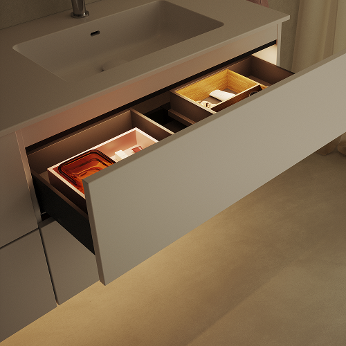 Sensorstyrd LED-belysning under kommod och i övre låda som fadar upp när du kommer in i rummet.