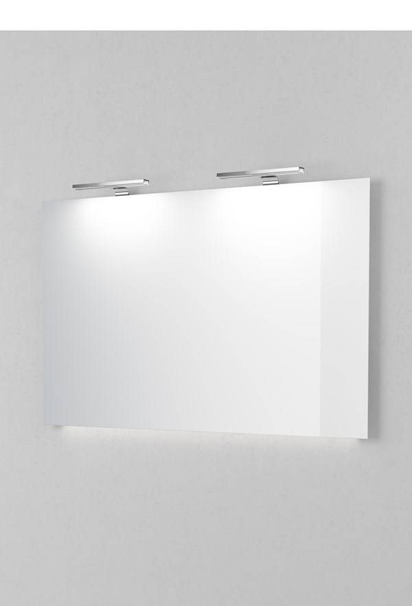 En klassisk badrumsspegel, där belysningsarmatur och effektfull underbelysning i LED ingår.