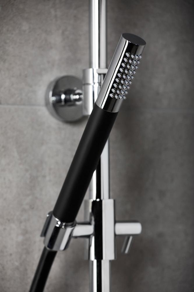 MIST är en i höjdled justerbar takdusch med rund taksil och flera varianter på färg på slang och handdusch.