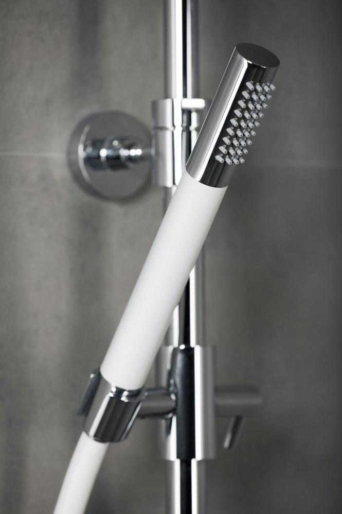 MIST är en i höjdled justerbar takdusch med rund taksil och flera varianter på färg på slang och handdusch.