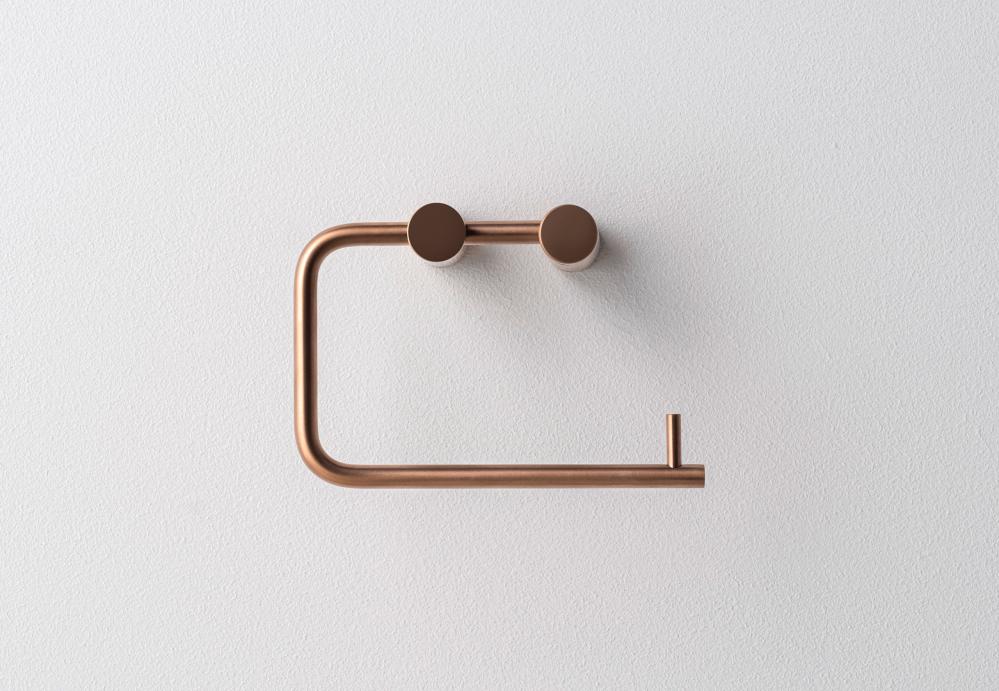 Toalettpappershållare i rostfritt stål som matchar övriga produkter i samma finish. Infärgningen till varianterna Brushed Brass, Brushed Bronze och Matte Black sker via PVD-teknik vilket gör ytan många gånger starkare än till exempel krom och vanlig lackering. De ofärgade varianterna Brushed Stainless och Polished, med borstad respektive handpolerad yta, kommer i sin naturliga kulör som är något varmare än traditionella mässingsprodukten med kromad yta – och betydligt tåligare.