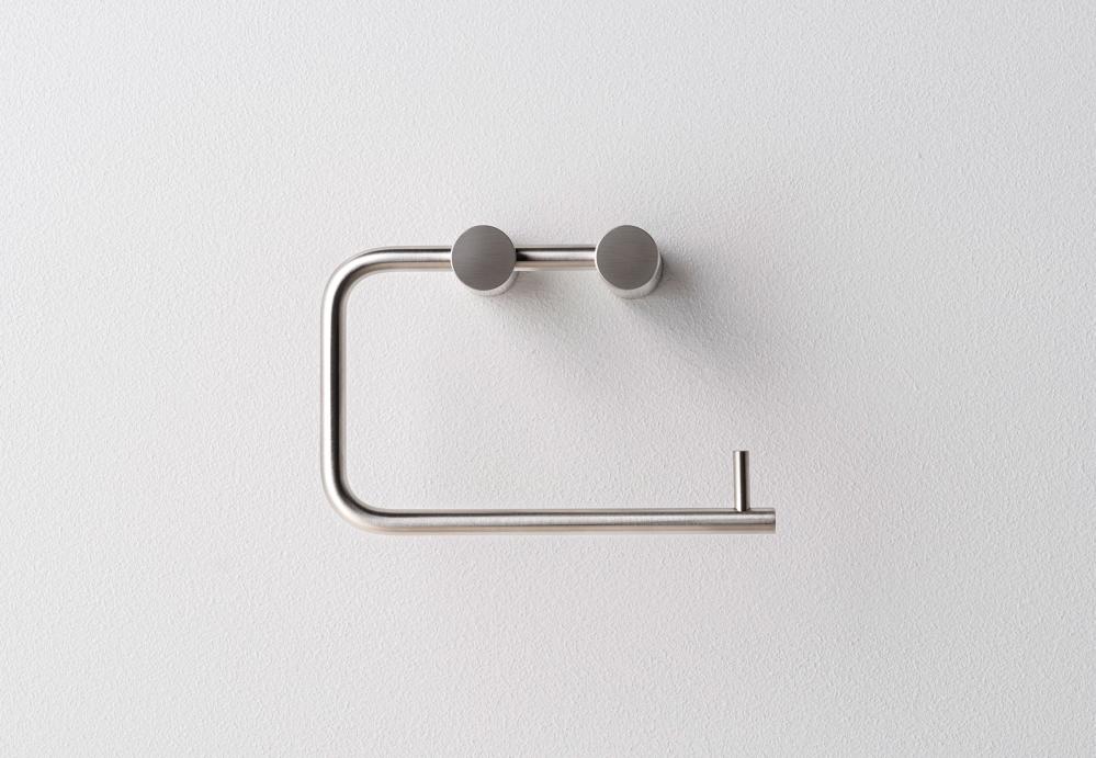 Toalettpappershållare i rostfritt stål som matchar övriga produkter i samma finish. Infärgningen till varianterna Brushed Brass, Brushed Bronze och Matte Black sker via PVD-teknik vilket gör ytan många gånger starkare än till exempel krom och vanlig lackering. De ofärgade varianterna Brushed Stainless och Polished, med borstad respektive handpolerad yta, kommer i sin naturliga kulör som är något varmare än traditionella mässingsprodukten med kromad yta – och betydligt tåligare.