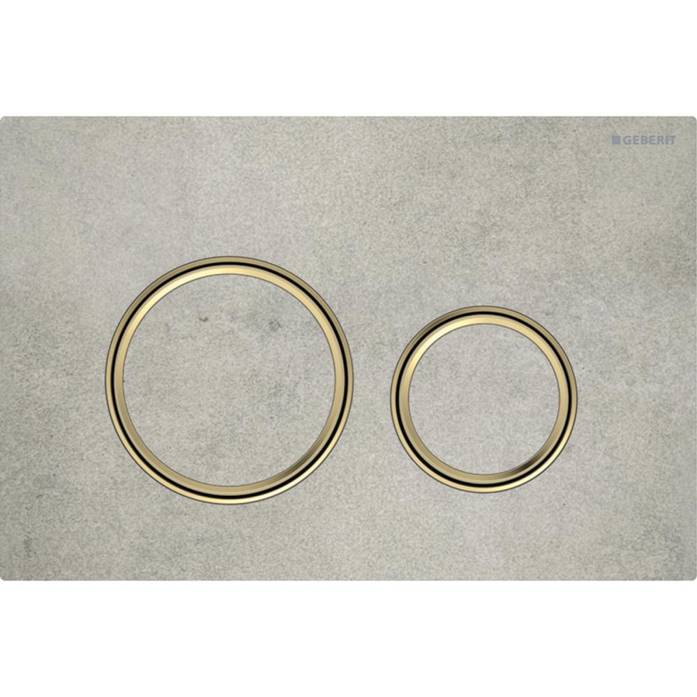Montageplatta och designringar: mässing. Täckplatta och knappar: betongoptik.