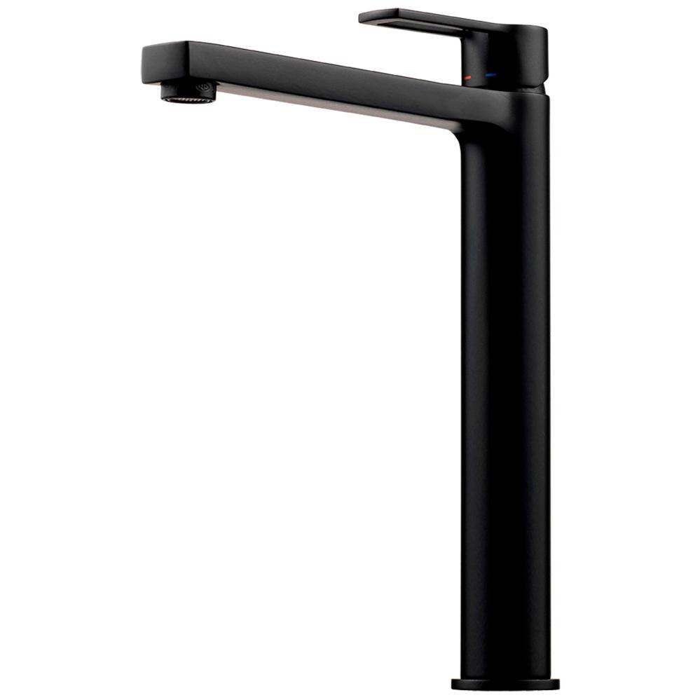 Handfatskran/tvättställsblandare Tapwell RIN081 i matt svart. Ej vridbart huvud. Utsprång 204 mm, produkthöjd 230 mm, bredd 52 mm, djup 230 mm. Ska kombineras med pop up-/uppfällbart avlopp.